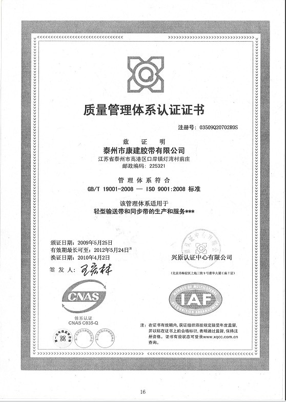 泰州市康建膠帶有限公司經(jīng)過十多年的發(fā)展已經(jīng)成為一家從事輸送帶和傳動帶類及相關(guān)設(shè)備生產(chǎn)和銷售的公司。位于中國經(jīng)濟(jì)發(fā)達(dá)的長三角經(jīng)濟(jì)圈江蘇省泰州市高港區(qū),交通發(fā)達(dá)。我司以“合格的產(chǎn)品,滿意的服務(wù)”為宗旨,發(fā)揚團(tuán)結(jié)、開拓、拼搏爭先的創(chuàng)業(yè)精神,“康建”在全國行業(yè)樹立了良好的企業(yè)形象。“康建”產(chǎn)品已通過ISO9001國際質(zhì)量體系認(rèn)證,從原料﹑工藝等方面進(jìn)行了嚴(yán)格的控制,從而確保了產(chǎn)品質(zhì)量的穩(wěn)定可靠,成為各......